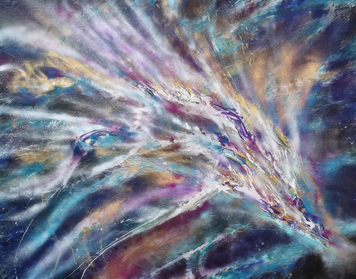 Deep purple lays behind turquoise jet streams and golden energy fields